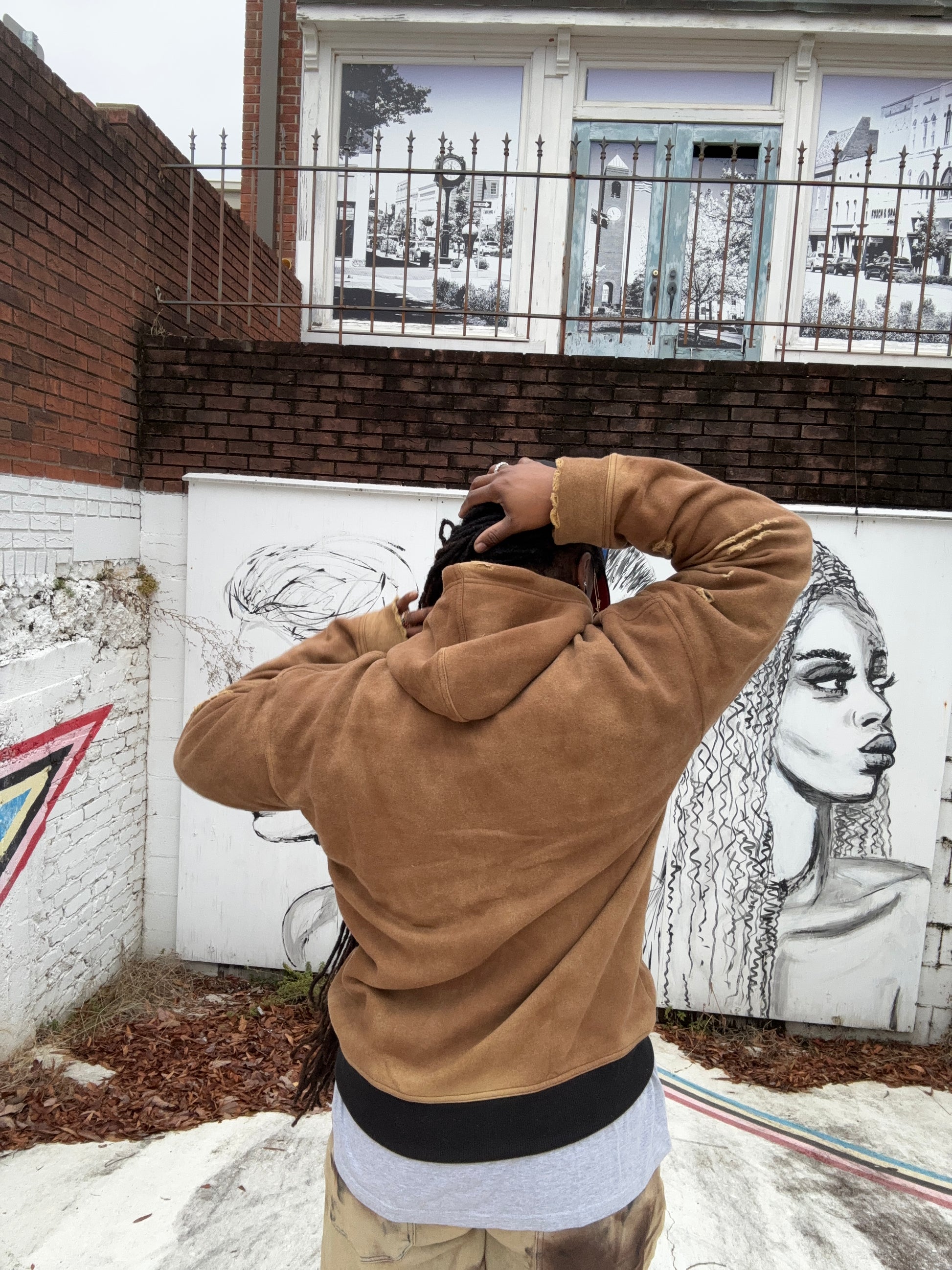 Oversized , distressed hoodie in vintage khaki with a black patch, with the logo encased. Don’t let this layer-able hoodie fool you, it’s packed with warm equal to a heavyweight hoody